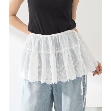 ナチュラルな雰囲気のエンブロイダリーレースで仕立てたラップスカート。たっぷりとギャザーを施したふんわりフォルムに、裾のスカラップデザインがフェミニンな印象です。カジュアルからきれいめまで、幅広いスタイルと着合わせしやすいのも嬉しいポイント。いつものボトムに重ねるだけで、スタイリングをぐっと格上げしてくれるおすすめのアイテムです。透け感[ややあり]
