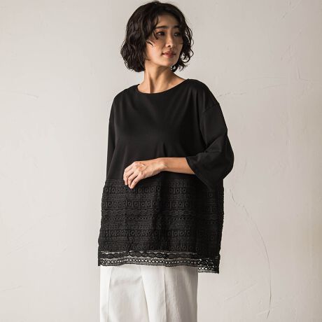 裾のケミカルレースがキャッチーでアクセントになるカットソープルオーバー。