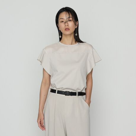 透け感のあるカラミときれいめなジャージーをドッキングしたブラウスのような感覚で着られる、プルオーバーです。