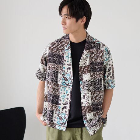 バティックやペイズリーなど、異なる柄を絶妙なバランスで切り替えたようなパネルプリントシャツ。