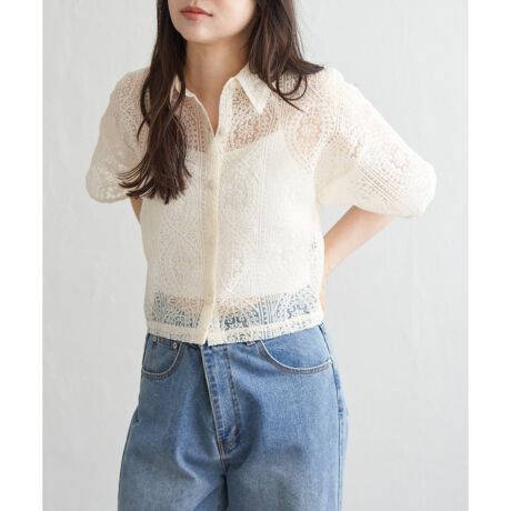 ショート丈のバランス感が新鮮な、ハーフスリーブのレースシャツ。