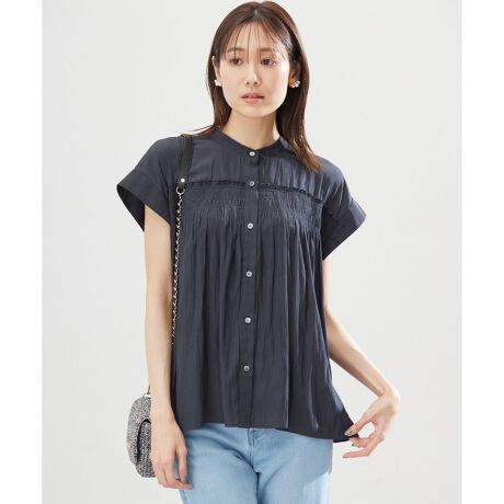 ■デザイン・胸元のゴムシャーリングとフリルがポイントのドロップドショルダーブラウス。・素材がソフトで落ち感があるのでギャザーが張り過ぎずスッキリとした印象に。・アウトしてもインしても着られる程よいレングス感。・同素材パンツとのセットアップ着用できれいめスタイルに。