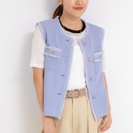 ・粗いゲージで、メッシュのように風通しよく編まれたラッセル素材を使用したベスト