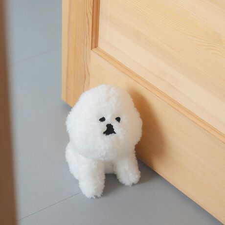 つぶらな瞳のふわふわ MAMBO 。一見、かわいらしいぬいぐるみに見えて重さ約1kg。ドアストッパーとして扉を押さえます。