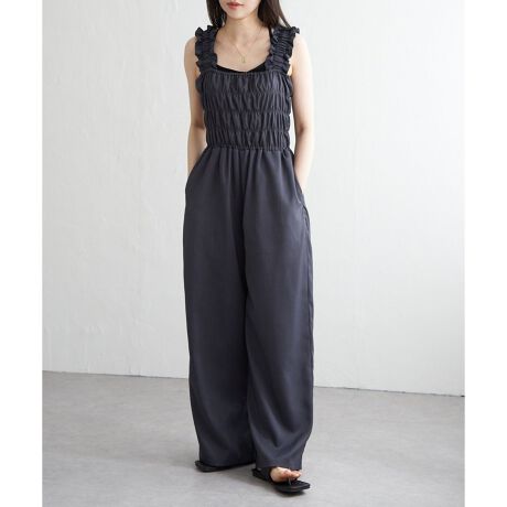 胸元にシャーリングを寄せた、メリハリのあるサロペット。