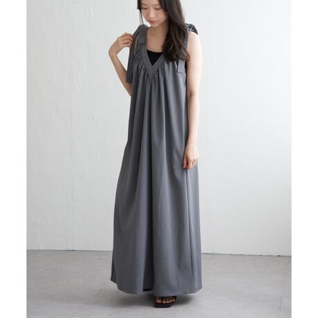肩にあしらったリボンがアクセントになるIラインワンピース。