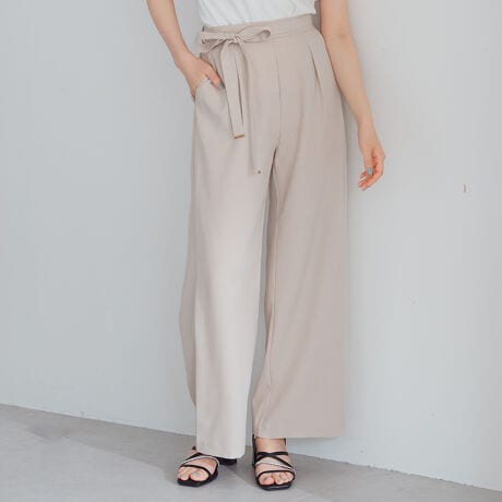 ウエストのリボンがフェミニンなアクセントになったワイドパンツ。