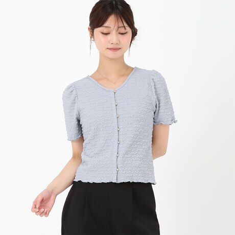 ぽこぽことした生地が表情豊かな印象を与えるトップス。生地端はメロー加工を施し、可愛らしいアクセントになります。首元をすっきり魅せるゆとりのあるネックラインが魅力。パンツはもちろん、スカートにも合わせやすいアイテムです。■fabric透け感[やや有り]裏地[すべて有り]伸縮性[有り]生地の厚さ[普通]