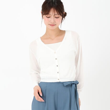 きらきらとしたラメシアーが華やかさを演出するカーディガン。首元はVネックになっており、デコルテラインを美しく見せてくれます。脚長効果のある短めの着丈もポイント。季節の変わり目のお出かけシーンに大活躍するアイテムです。■fabric透け感[有り]裏地[無し]伸縮性[有り]生地の厚さ[薄手]