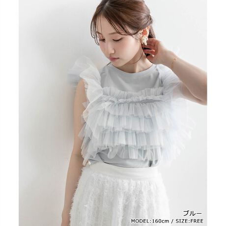 チュールフリルが華やぐ、女性らしいドッキングカットソー。