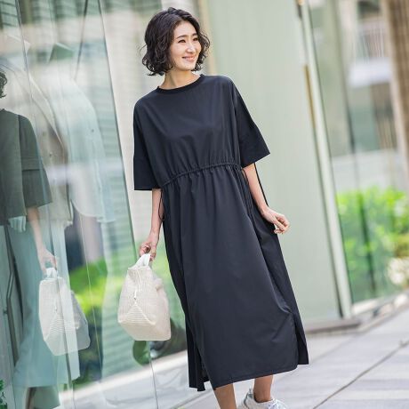 布帛とジャージーを切り替え、着やすさとデザイン性を兼ね備えたドッキングワンピース。