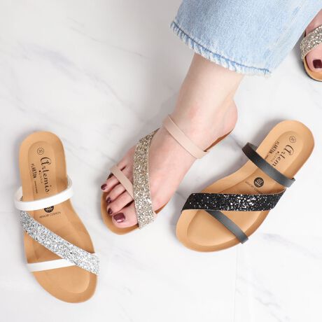 華やかなグリッターとバイカラーがポイントのフラットサンダル。