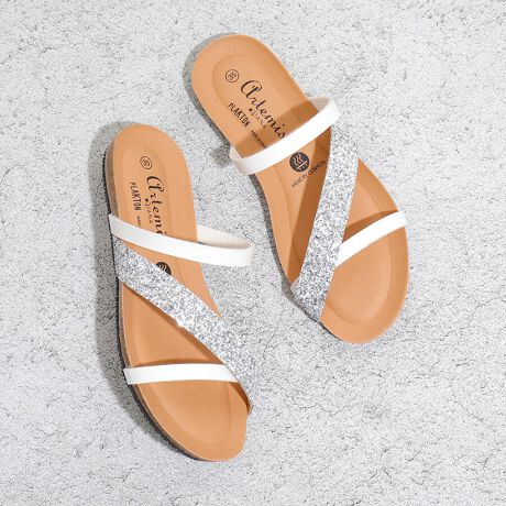 華やかなグリッターとバイカラーがポイントのフラットサンダル。