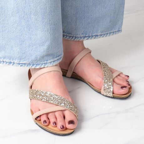 華やかなグリッターとバイカラーがポイントのフラットサンダル。