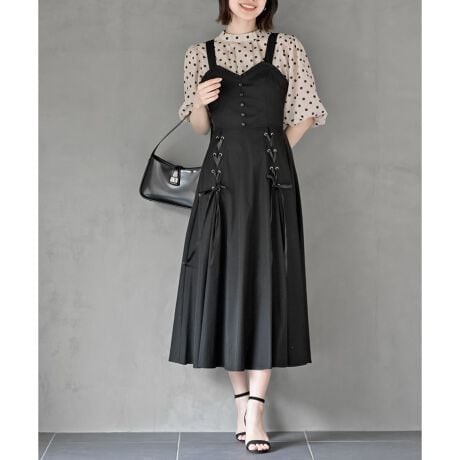 腰のレースアップがポイントになったガーリーなジャンスカワンピ。