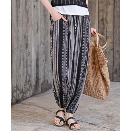 エスニックなプリントが季節感のあるコーデを演出するパンツ。