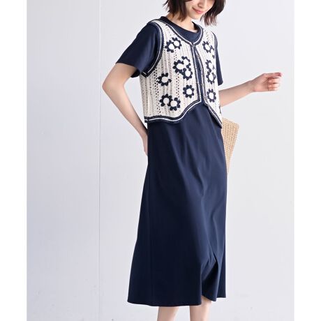 シンプルなワンピにカギ針ベストがついたお得なアイテム。
