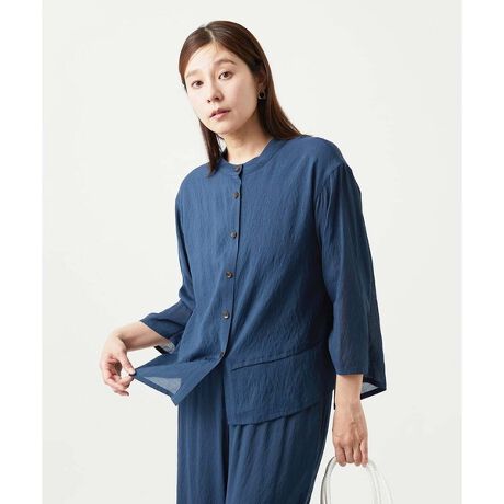 衿は小さめのスタントガラーに仕上げ、前を閉めても開けても決まるブラウス。風になびく涼やかな素材感で夏に最適なアイテムです。前身頃はティアード風の2枚重ねで仕上げ、後身頃はヨーク切り替え部分からアシンメトリーに切り替えていて、着用すると生地の動きを感じられるカッティングが特徴です。