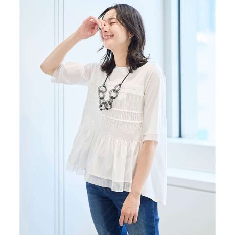 レイヤード風のスタイルを楽しめるチュールドッキングカットソー