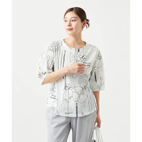 線で描かれた花柄とほのかな葉っぱ柄が、やさしい印象をあたえるプリントカットソーです。キーネックの衿ぐりは、見返し始末でカジュアルすぎない印象に仕上げました。立体的に作った袖は華やかさをプラス。ラウンドした裾デザインで、ブラウス見えするシルエットに。