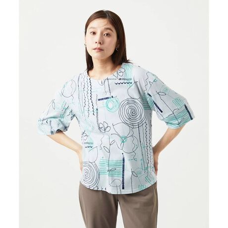 線で描かれた花柄とほのかな葉っぱ柄が、やさしい印象をあたえるプリントカットソーです。キーネックの衿ぐりは、見返し始末でカジュアルすぎない印象に仕上げました。立体的に作った袖は華やかさをプラス。ラウンドした裾デザインで、ブラウス見えするシルエットに。