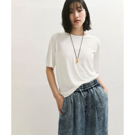 ワイドスラックスや、イージーデニム、プリントスカート等、様々なボトムに合わせやすい汎用性のあるTシャツ。