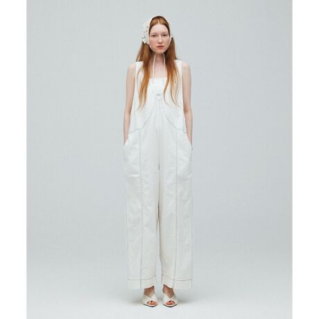 フロントに大きく胸下切り替えを施したデニムロンパース。