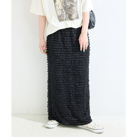 すっきり見えするストレートシルエットにすることでフリルデザインも大人めに着やすくしており、Tシャツと合わせるだけで甘めなテイストに仕上がります。裏地は膝丈にし、夏でも着用できるようにシアー感を楽しめるようにお作りしました。