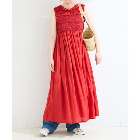 落ち感のあるコットンレーヨン素材を使用した夏に向けてぴったりなスリーブレスワンピースです。上半身にスモッキング刺繍を施し顔まわりが華やかな印象に、スモッキングから続くギャザーがストンと落ちるシルエットで大人の方にもおすすめです。