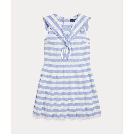 この季節にぴったりのリネンとコットンのドレス。チャーミングなセーラーカラー、ストライプモチーフ、遊び心たっぷりのプリーツスカートを組み合わせたアイテム。・ノースリーブのシルエット・ストライプ入りセーラーカラー / 背面にスプリットカラー / 背面中央に4つボタンのプラケット・プリーツスカート・フロントの右裾にPoloの刺繍※商品の色味は、光のあたり具合など諸条件により色感が多少異なって見える場合がございますので予めご了承下さい。 【素材】・本体:麻 55%、綿 45% 装飾部分を除く【生産国】インドネシア