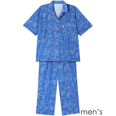 【メンズパジャマ(5分袖8分丈パンツ)】・やわらかくなめらかな肌ざわりの綿100%の天竺素材を使用・糸を撚る回数の少ない甘撚りの糸を使っているので、やわらかな風合い・特殊な製法の糸を使用し、洗濯を繰り返してもやわらかな風合いが長持ちしやすく、毛玉になりにくい・大阪・京都それぞれの都市の観光名所を連想させるモチーフをちりばめた手描き風のグラフィティ調プリントBU・IVカラー:OSAKA柄GYカラー:KYOTO柄【サイズ詳細】M:身幅56.0cm 身丈69.5cm 着丈69.0cm 肩幅48.0cm 袖丈26.0cm ボトム脇丈85.0cm 裾まわり48.5cm ウエスト66.0cm ヒップ110.0cm 股下(レングス)57.5cmL:身幅60.0cm 身丈74.5cm 着丈74.0cm 肩幅50.0cm 袖丈27.5cm ボトム脇丈90.5cm 裾まわり51.5cm ウエスト72.0cm ヒップ118.0cm 股下(レングス)61.5cm※出来上がり寸法を表示しております