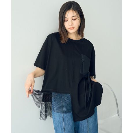 カットソーとメッシュ素材を組み合わせたアシンメトリーなデザインのTシャツ。