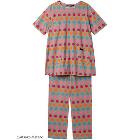 【パジャマ(5分袖ロング丈パンツ)】クリエーター“俣野温子”氏がデザインする、甘くなりすぎない大人かわいいテキスタイルとカラーで、くつろぎ時間を楽しく過ごせるパジャマ&ルームウェア・綿100%の天竺素材を使用・大きめのマルチドットが素敵なテキスタイル・ポケットから顔をのぞかせている黒猫のアップリケがデザインポイント【サイズ詳細】M:身幅53.5cm 着丈68.5cm 身丈72.0cm 肩幅39.0cm 袖丈24.5cm ボトム脇丈95.0cm 裾まわり43.0cm ウエスト58.0cm ヒップ100.5cm 股下(レングス)67.5cmL:身幅57.5cm 着丈68.5cm 身丈72.5cm 肩幅40.5cm 袖丈24.5cm ボトム脇丈95.5cm 裾まわり45.0cm ウエスト63.0cm ヒップ104.5cm 股下(レングス)67.5cmLL:身幅61.5cm 着丈69.5cm 身丈73.5cm 肩幅42.0cm 袖丈25.0cm ボトム脇丈96.0cm 裾まわり48.0cm ウエスト68.0cm ヒップ109.5cm 股下(レングス)67.5cm3L:身幅65.5cm 着丈70.5cm 身丈74.5cm 肩幅43.5cm 袖丈25.0cm ボトム脇丈96.5cm 裾まわり51.0cm ウエスト73.0cm ヒップ114.5cm 股下(レングス)67.0cm4L:身幅69.5cm 着丈71.5cm 身丈75.5cm 肩幅45.0cm 袖丈25.0cm ボトム脇丈97.0cm 裾まわり54.0cm ウエスト78.0cm ヒップ119.5cm 股下(レングス)67.0cm※出来上がり寸法を表示しております※サイズ詳細の寸法には多少の差異がございます※アイテムによって柄の出方が異なりますのでご了承ください。