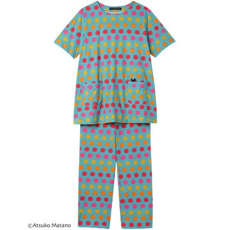 【パジャマ(5分袖ロング丈パンツ)】クリエーター“俣野温子”氏がデザインする、甘くなりすぎない大人かわいいテキスタイルとカラーで、くつろぎ時間を楽しく過ごせるパジャマ&ルームウェア・綿100%の天竺素材を使用・大きめのマルチドットが素敵なテキスタイル・ポケットから顔をのぞかせている黒猫のアップリケがデザインポイント【サイズ詳細】M:身幅53.5cm 着丈68.5cm 身丈72.0cm 肩幅39.0cm 袖丈24.5cm ボトム脇丈95.0cm 裾まわり43.0cm ウエスト58.0cm ヒップ100.5cm 股下(レングス)67.5cmL:身幅57.5cm 着丈68.5cm 身丈72.5cm 肩幅40.5cm 袖丈24.5cm ボトム脇丈95.5cm 裾まわり45.0cm ウエスト63.0cm ヒップ104.5cm 股下(レングス)67.5cmLL:身幅61.5cm 着丈69.5cm 身丈73.5cm 肩幅42.0cm 袖丈25.0cm ボトム脇丈96.0cm 裾まわり48.0cm ウエスト68.0cm ヒップ109.5cm 股下(レングス)67.5cm3L:身幅65.5cm 着丈70.5cm 身丈74.5cm 肩幅43.5cm 袖丈25.0cm ボトム脇丈96.5cm 裾まわり51.0cm ウエスト73.0cm ヒップ114.5cm 股下(レングス)67.0cm4L:身幅69.5cm 着丈71.5cm 身丈75.5cm 肩幅45.0cm 袖丈25.0cm ボトム脇丈97.0cm 裾まわり54.0cm ウエスト78.0cm ヒップ119.5cm 股下(レングス)67.0cm※出来上がり寸法を表示しております※サイズ詳細の寸法には多少の差異がございます※アイテムによって柄の出方が異なりますのでご了承ください。