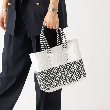 メルカドバッグは、メキシコに古くから伝わる技法で編まれた、再生プラスティック素材のかごバッグです。