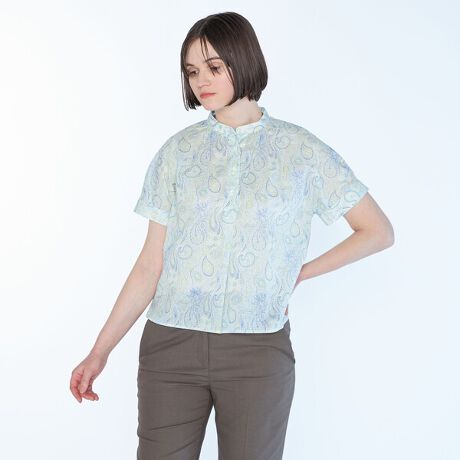 エスニック感あふれるペイズリー柄を、淡く明るい配色でデザインしたブラウス。スタイリッシュな印象のスタンドカラーを採用しています。衿回りにはさりげなくギャザーを施して、フェミニンをプラス。薄手の生地感の軽やかさが夏らしいリゾートコーディネートにもぴったりです。着丈は少し短めですっきりと着こなせます。