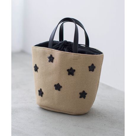■デザイン・素材・ソフトな雑材シートを使用し、持ち手はスムース合皮仕様に。・口元は巾着で開閉できるので、中身が見えず安心。・内装にはオープンポケットが1つついており小物の小分けに便利。・バッグのフロントにはスパンコールの星モチーフを配置し大人の遊び心をプラス。・本体は軽量で、ソフトな造りになっており、デイリー使いにおすすめ。