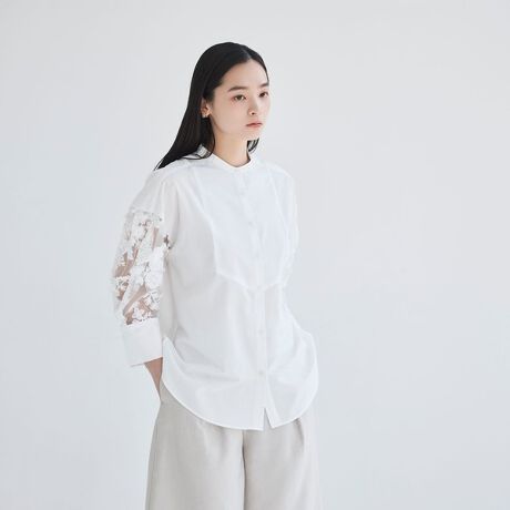 7分丈のパフスリーブに繊細なフラワー刺しゅうレースを施したエレガントなブラウス。カフスは折り返してダブルにも可能で、様々なスタイリングに対応します。ハレの日はもちろん、カジュアルなボトムと合わせてオフの日まで幅広く活躍します。