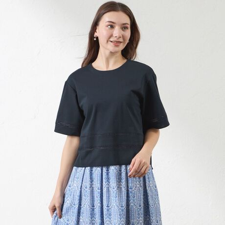 クルーネックの短め丈の半袖トップスです。袖口と裾に細レースを切り替えたデザインで、涼しげな印象で着用いただけます。