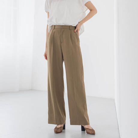 セルロース混の落ち感とシャリっとした清涼感のあるタッチが特徴的な素材のタックパンツ。