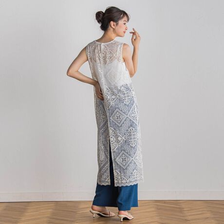 クラフト感溢れる大柄のラッセルレースが魅力のレイヤードワンピース。