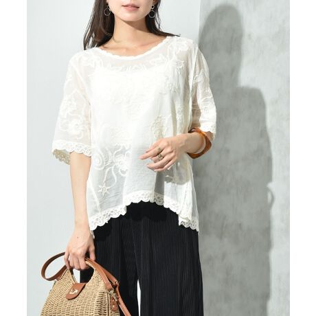 程よくゆったりとしたシルエットで、ボディラインを気にせず着られるおすすめなトップス。透け感がほとんどないコットン素材を使用し、上品な刺繍が目を惹きます。裾や袖口はスカラップのデザインでほんのりと大人の甘さが感じられる1枚。