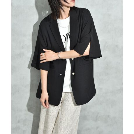 麻調の素材はさらりと肌触りが心地よく、ナチュラルな風合いが程よくカジュアルダウンしてくれます。パールボタンが目を惹き、クールな印象のテーラードカラーできちんと感もしっかりと出るアイテムです。また長めの袖丈にスリットを施し、腕周りや手元を綺麗に演出してくれるのも◎