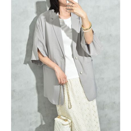 麻調の素材はさらりと肌触りが心地よく、ナチュラルな風合いが程よくカジュアルダウンしてくれます。パールボタンが目を惹き、クールな印象のテーラードカラーできちんと感もしっかりと出るアイテムです。また長めの袖丈にスリットを施し、腕周りや手元を綺麗に演出してくれるのも◎