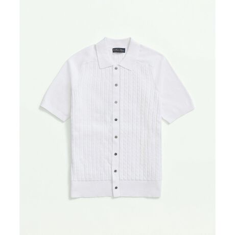 クラシカルなケーブル編みの身頃にフラットな編み地の袖と襟を組み合わせ、前立てに白蝶貝のボタンを並べた、オーセンティックな印象のポロセーターです。体に程よくフィットする上品なシルエットに仕上げました。一枚ではもちろん、前を開けて羽織るスタイリングや、シャツのようにジャケットスタイルのインナーとしてお召しいただくのもお薦めです。