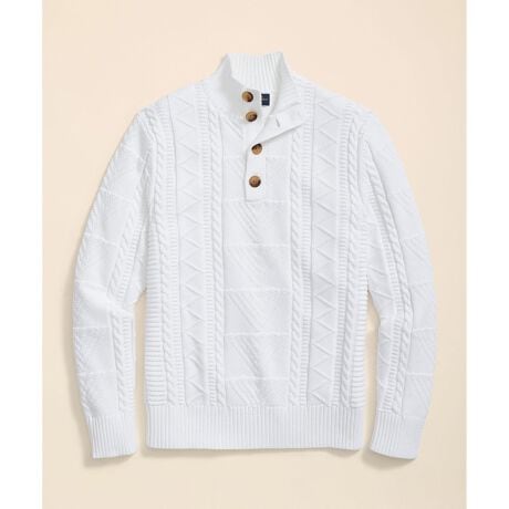 洗いざらしのオックスフォードシャツやマリナーストライプのTシャツの上に重ねて端境期のレイヤードスタイルを楽しめるハーフボタンのモックネックセーター。程よい厚みと快適な通気性を備えています。気品の漂うクリーンなホワイトのセーターは、ヨットハウスや海辺のカフェテリアで過ごすひとときにもぴったりです。
