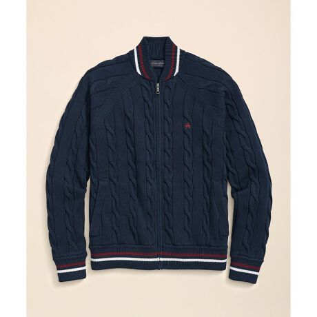 テニスウェアからインスピレーションを得た、クラシックなケーブル編みのフルジップセーターです。スポーティーなホワイトとバーガンディのライン、左胸のGF(ゴールデン フリース)ロゴの刺繍がアクセント。通気性に優れ、タウンユースはもちろんテニスやゴルフを楽しむときにもお薦めです。