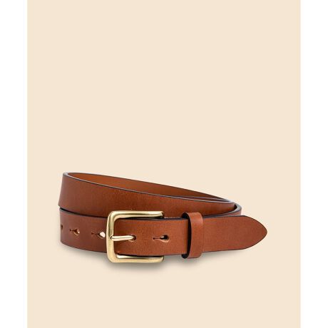 革の断面にコバ仕上げのみを施し、ステッチ無しで柔らかく仕上げました。カジュアルなパンツと相性の良い、革の質感を活かした一本です。明るいブラウンが、コーディネートに軽快なアクセントを添えます。