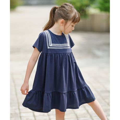 ■デザインヨークにあしらった2種類の白いレースがマリンな印象を与えてくれるワンピースです。ヨーク下から入ったたっぷりなギャザーと裾の切り替えで、ふんわりとしたシルエットになっております。