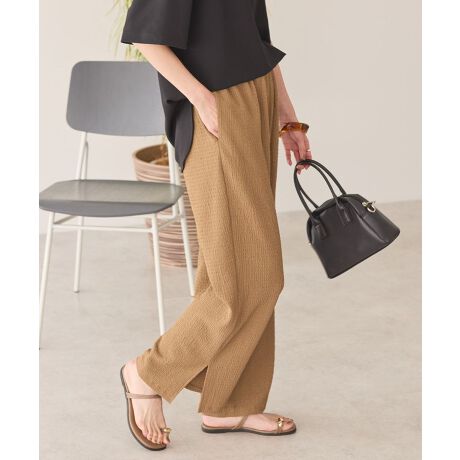 伸縮性のある素材で仕立てたリラクシーな穿き心地のイージーパンツ。ポコポコとしたシャーリングの表面感が、シンプルなトップスに合わせるだけでおしゃれな雰囲気を演出します。ベーシックな色を揃えた豊富なカラーバリエーションにも注目。ボリューム感のあるオーバーシャツやTシャツと合わせたラフなスタイリングがおすすめな旬アイテムです。透け感[なし]